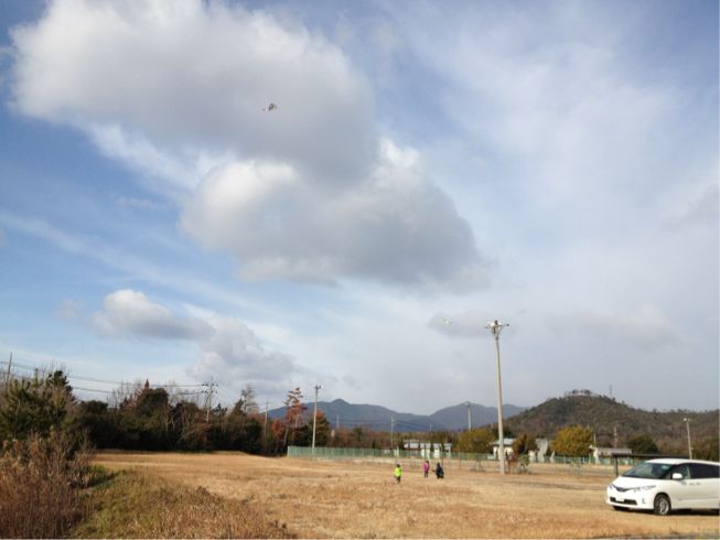 今朝、家族で凧上げをやってみました。
